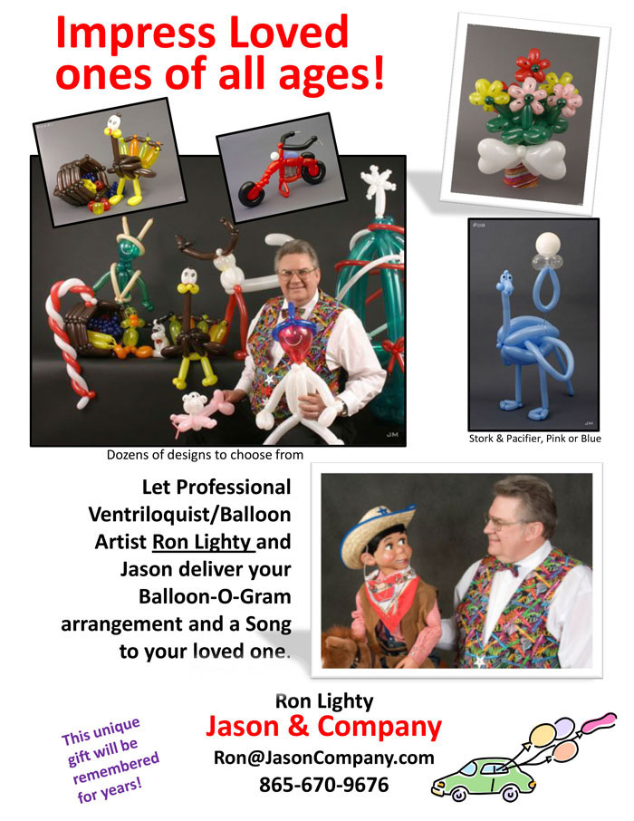 Ron Lighty has been doing ventriloquism, puppetry, and balloon art for over fourty five years. Ron also conducts workshops for the art of ventriloquism all over the United States. Ron performs for audiences of all ages and he makes no apology for providing good, clean, and wholesome entertainment for you or your organization. Ron performs for schools, churches, senior citizens, private parties, birthdays, family reunions, picnics, banquets, boy scouts, girl scouts, grand openings, and just about any event you can think of! Ron is an author, he has performed on both radio and television, and participated in a documentary film about ventriloquism in 1997. Please have a look around the web site and be sure to drop Ron a line with any questions or comments you may have.